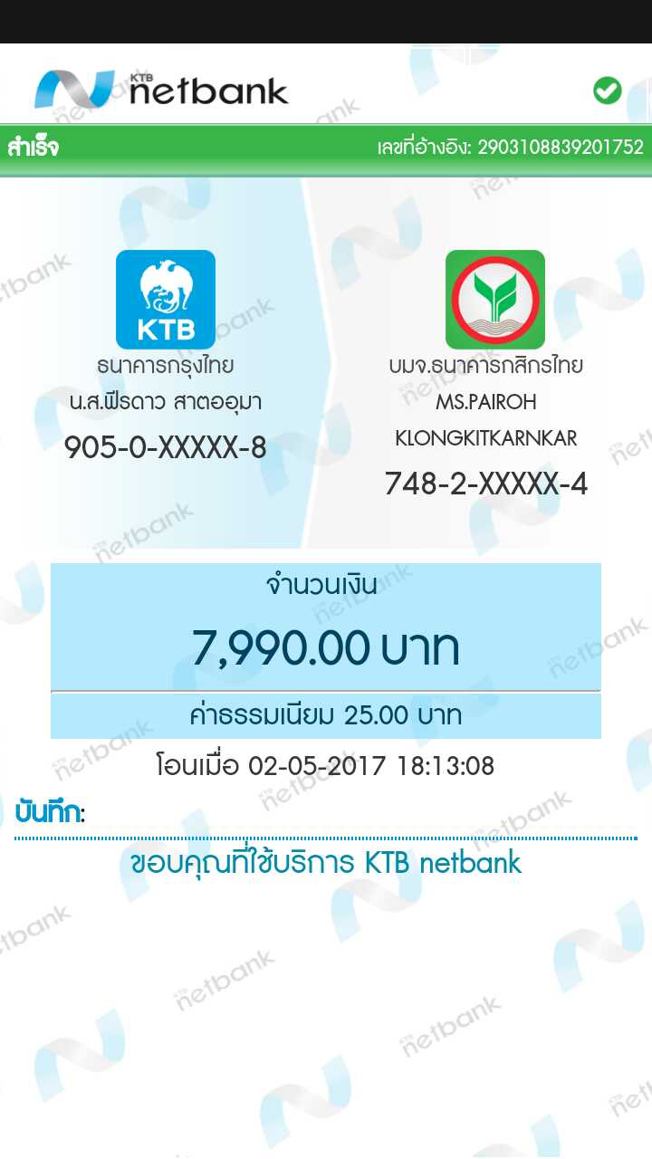โอนเงินเข้าในบัญชีธนาคารกศิกรจากธนาคารกรุงไทย